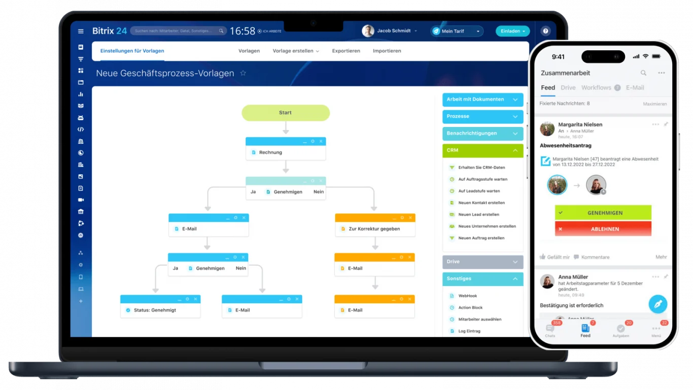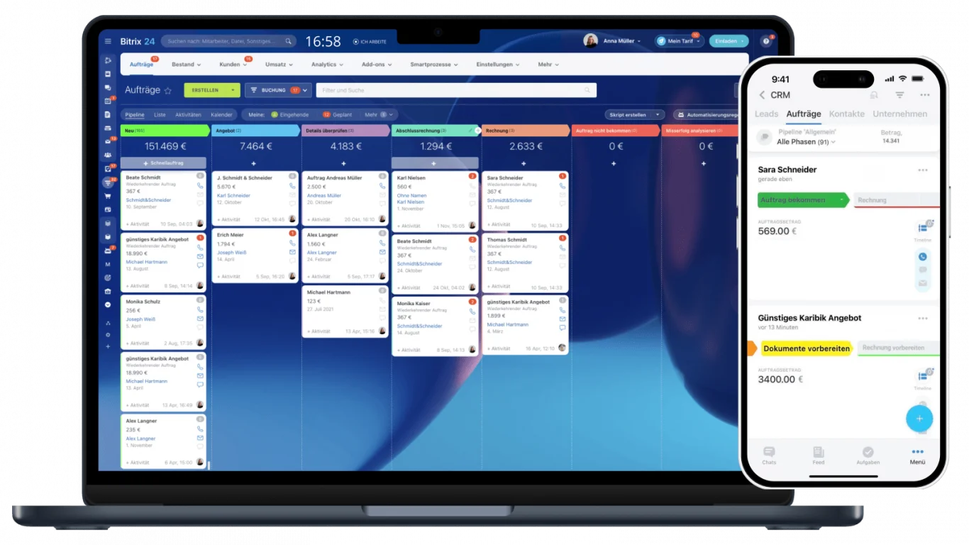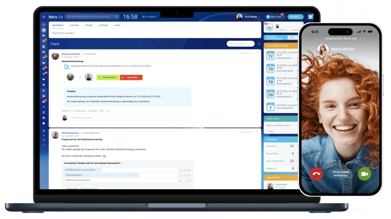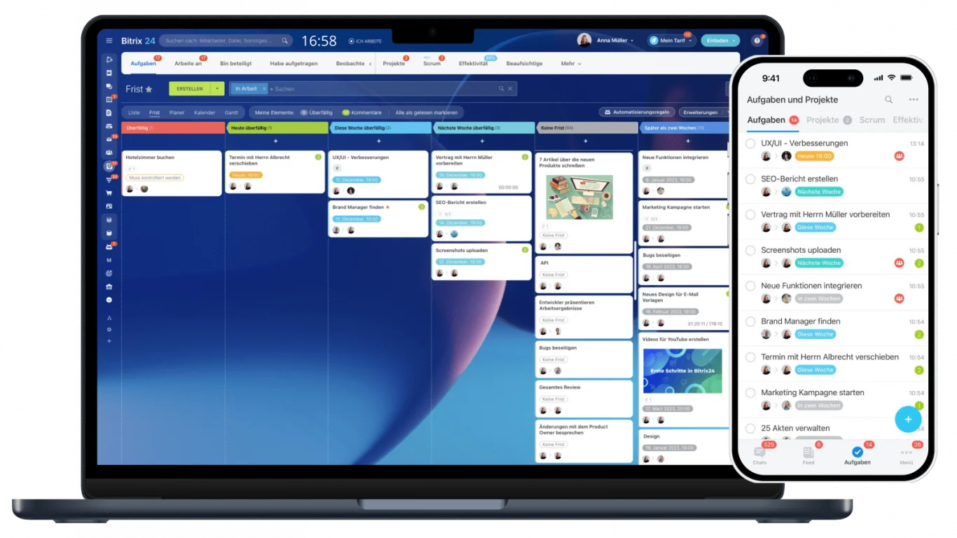 Bitrix24 hilft Ihnen, Ihre Leistung und Produktivität zu steigern, Projekte mit Leichtigkeit zu erledigen und unnötigen Aufwand zu vermeiden. Wenn Sie einen schnellen Fortschritt machen und große Chancen nutzen möchten, wird Bitrix24 die Motoren dafür laufen lassen und sich um die kleinen Dinge kümmern.